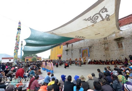 8月6日,在西藏堆龍德慶縣乃瓊鎮(zhèn)甲熱村,甲熱村覺木隆藏戲團(tuán)在村里的雪頓節(jié)曬佛慶典上表演。