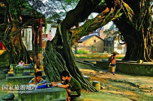 其四,鏡頭也能說故事,圖片里面有人文。呂建偉并沒有把古榕、古建筑當(dāng)作無生命的標(biāo)本來拍攝,而是用鏡頭來記錄那方水土中人們的生存環(huán)境、生活內(nèi)容和精神風(fēng)貌,讓平面的圖片凸顯出豐富的、具有特色的人文元素來。從圖片的標(biāo)題《冬陽遍灑暖人間》、《古榕塘畔好“擺古”》、《憶往昔舊事歷歷味更濃》、《看今朝雛燕展翅欲高飛》中,就能看出作者“以攝影圖片說人文”的理念。