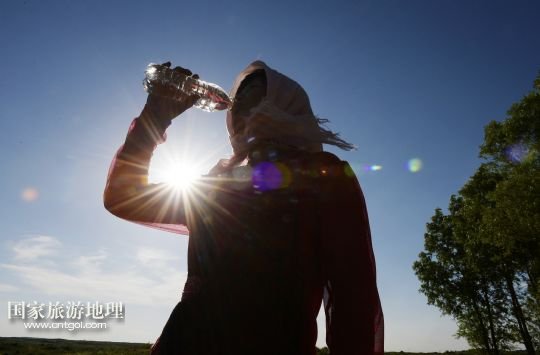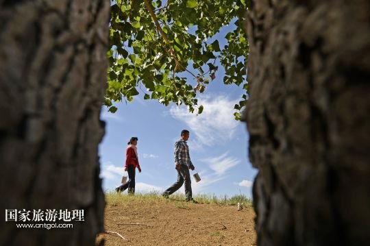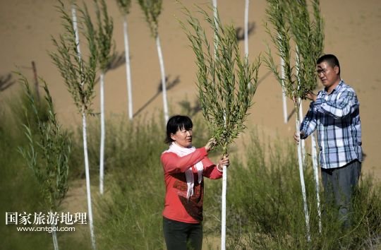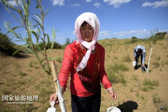 國(guó)家旅游地理 寧夏銀川10月11日訊 圖為顧蕓香(8月14日攝)  14年來(lái),寧夏靈武農(nóng)民顧蕓香的心,不知隨著沙漠里的樹(shù)“生生死死”了多少回。