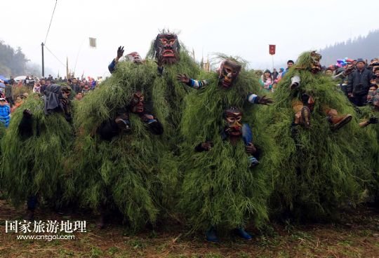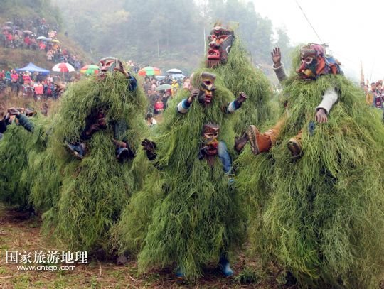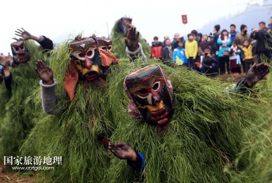國家旅游地理 廣西柳州2月20日訊 2月16日,一名苗族青年戴著面具、披著芒草,扮成 “芒哥”跳舞。當日是農歷正月十七,地處深山的廣西柳州市融水苗族自治縣安陲鄉(xiāng)在江門苗寨舉行傳統(tǒng)的“芒哥節(jié)”。眾多苗族男性青少年戴著面具、披著芒草、扮成“芒哥”起舞,為人們驅邪避禍,送去新春的祝福。據(jù)介紹,演“芒哥”是當?shù)孛缂胰霜毦咛厣男麓簜鹘y(tǒng)活動之一。 /新華社發(fā)(龍濤 攝)