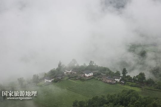 =6月10日,四川省寶興縣蹺磧藏族鄉(xiāng)嘎日村藏寨云霧繚繞。