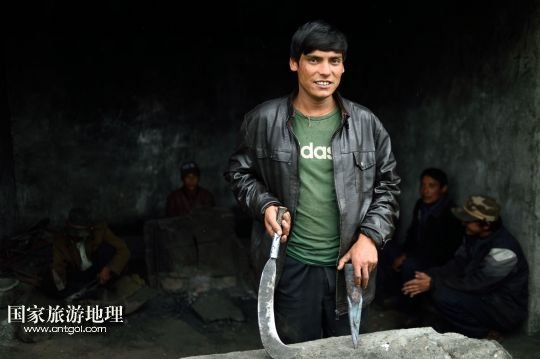 7月17日,巴桑次仁在達曼村的鐵匠鋪內(nèi)展示制作的農(nóng)具。