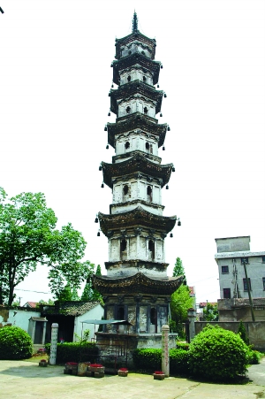 舍利塔坐落于龍游縣湖鎮(zhèn)鎮(zhèn)下街(通濟(jì)街)。先有舍利寺,后有舍利塔。舍利塔建于北宋嘉祐三年(1058),為六面七層仿木樓閣式實(shí)心磚塔,高27.31米。普通基座,平面呈六角形,邊寬2.3米,須彌座高1.6米。1至6層每層皆砌出平座、柱枋、斗栱形式,每面中央設(shè)壺門式壁龕,內(nèi)供漢白玉釋迦牟尼佛像,共計(jì)36尊。塔檐用菱角牙子疊出檐層層起翹,檐頭持風(fēng)鈴,該塔整體構(gòu)造精巧、玲瓏剔透。