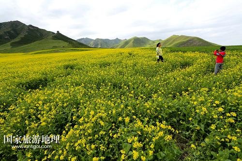 7月14日,游客在甘肅民樂油菜花海游覽。