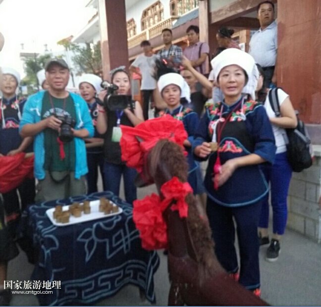 這是黔南惠水縣好花紅布依風情寨,為了歡迎遠方客人的到來,布依族人在寨門前擺滿酒杯唱起山歌。在進寨前客人都要喝三杯攔門酒,喝完才能進入寨中。同時,布依族習俗中,遠方客人到來,坐上木馬,喝完三杯米酒也寓意著會交好運。